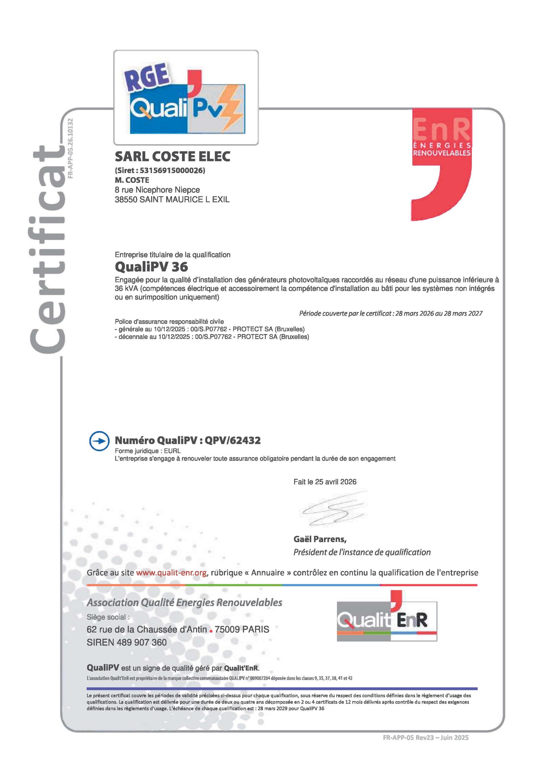 Agréé RGE QUALIPV ELEC et BAT pour des installations jusqu’à 36kVA (soit une centaine de panneaux par installation) la SARL COSTE ELEC est qualifiée pour faire bénéficier à ces clients des différentes aides, réalisation des demandes de raccordement ENEDIS, création de contrat de rachat avec EDFOA.